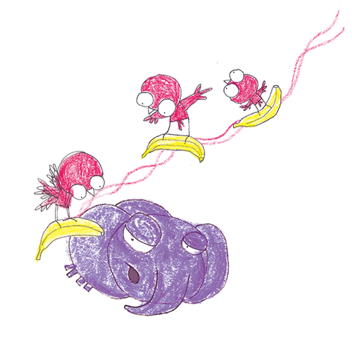 Den ene fortælling tager udgangs punkt i den ekstroverte fugl Flemming og hvordan elefanten Ernst redder dens liv.